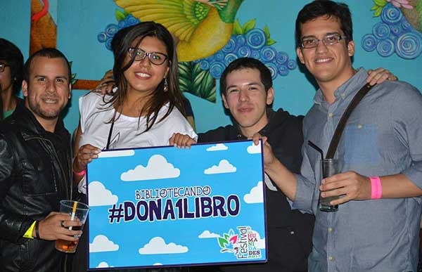 Colaboradores en la fiesta pro-fondos sosteniendo el cartel de “Bibliotecando #dona1libro” para la instalación de una biblioteca comunal en Huachipa.